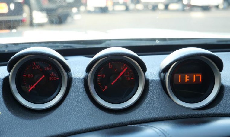 - Center-mounted 3-bay gauge cluster; oil temp; voltmeter; digital clock