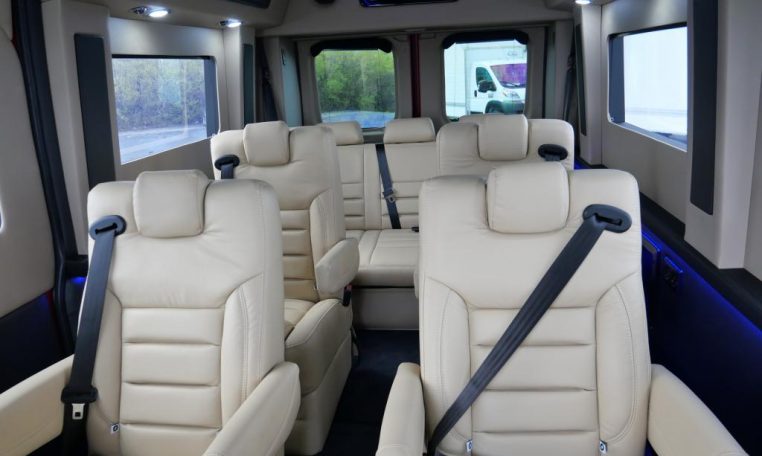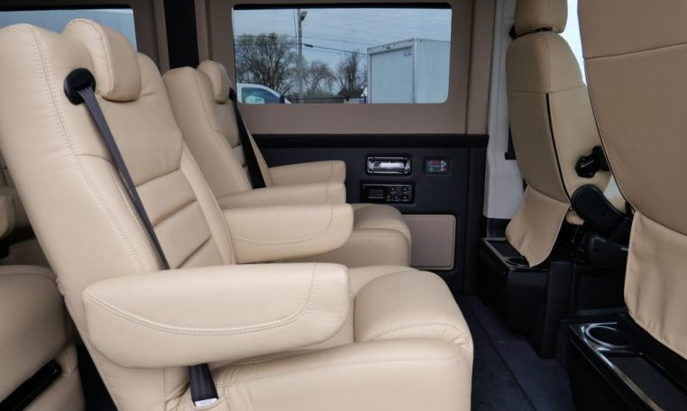 Interior: Tan Decor, Premium Leather Seating For 9 Passengers, Custom Pleated Privacy Day/Night Window Shades, Dynamat Sound Deadening, Premium Carpet, Glossy Interior Trim, LED Lighting, LED Lit Cupholders, Leather-Wrapped Steering Wheel