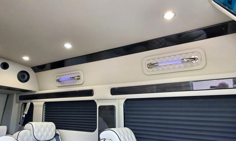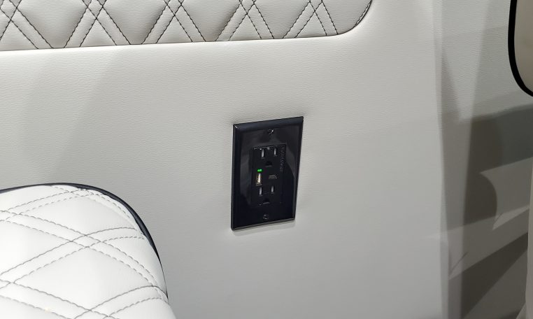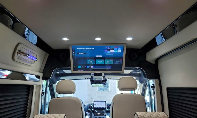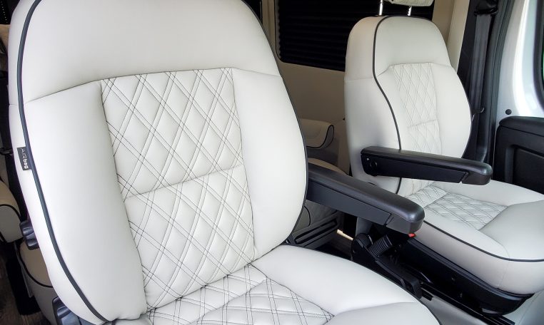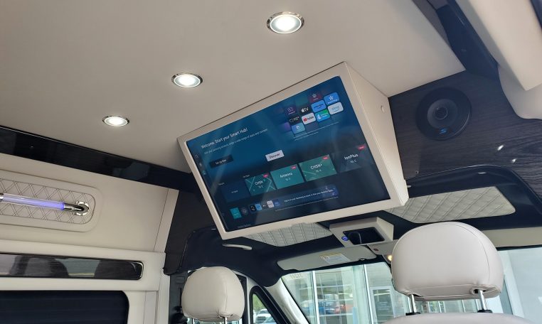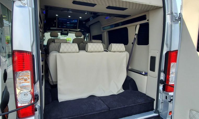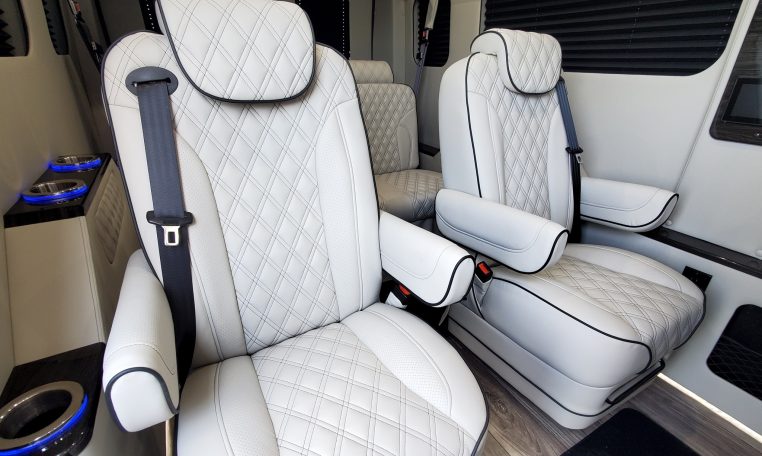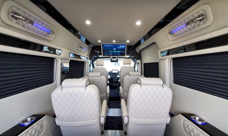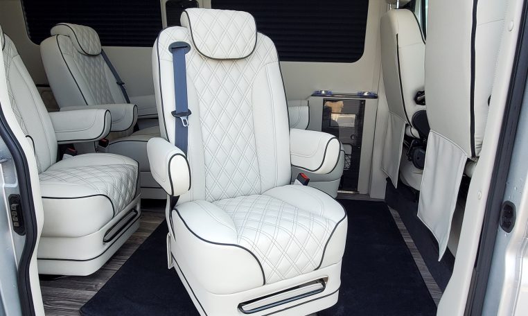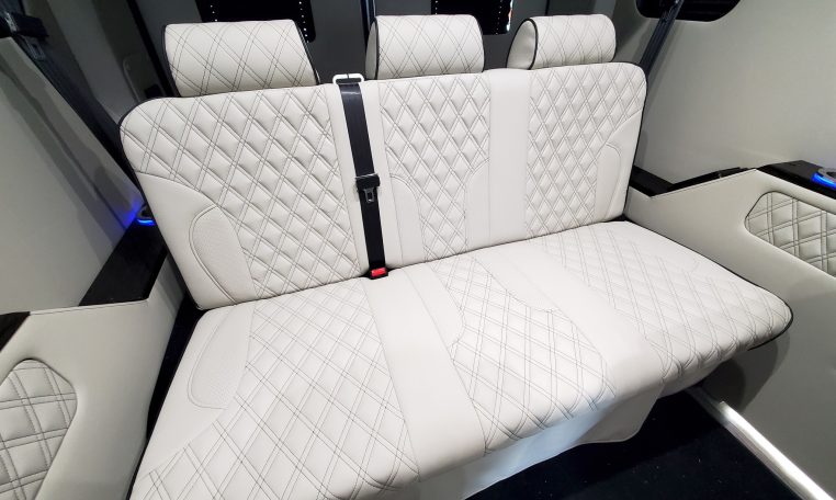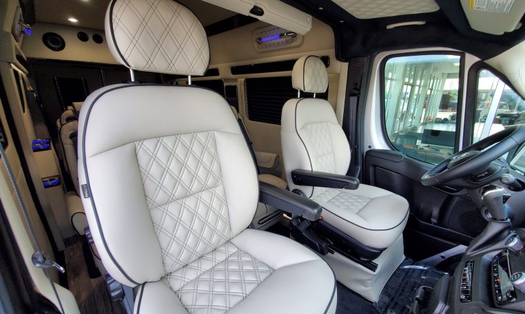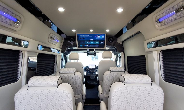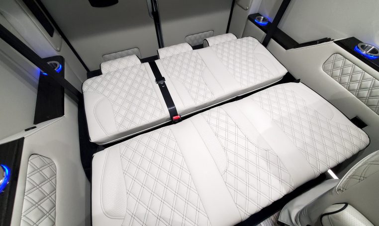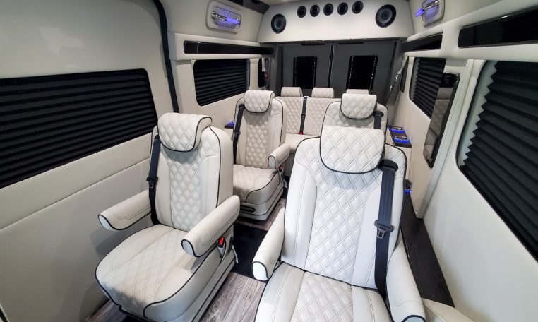— Midwest Automotive Designs 9 Passenger Luxury Conversion! Stand Up Inside–76-Inch Interior Height! Premium Diamond-Stitched Leather Seating – Quick-Release/Swivel 2nd/3rd Row Captain Chairs w/ Memory Foam – 2-Section Power Sofa/Bed – Smart HDTV – Remote HDMI TV Input – TV Antenna – Firefly Control System w/ 3 Touchscreen Displays – Rear Touchscreen Alpine Radio – Premium Alpine Speakers Throughout w/ Subwoofer – 1000 Watt Power Inverter – Deka Deep-Cycle Lithium Battery – Shore Power Input – 3 110V AC Power Outlets w/ USB Charge Ports – Premier Products Dual-Compressor Rear Climate Control System – Woodgrain Composite Flooring w/ Floor Mats – High-Gloss Genuine Wood Trim – Sound/Heat Insulation – Rear Privacy Window Shades – Indirect LED Accent Lighting – LED Reading Lights – Stainless Steel Cupholders – Painted Exterior Fascias/Trim – Painted Running Boards w/ Non-Slip Pads – AND MORE!