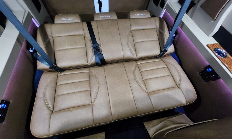 - Seating Layout: Premium Leather Seating • Swivel/Quick-Release 2nd & 3rd Row Captain Chairs • 2-Section Power Sofa/Bed