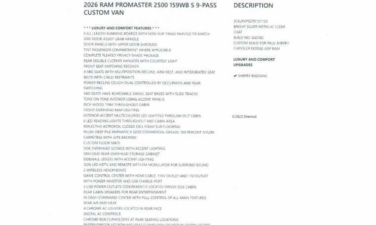 — 9 Passenger LUXURY VAN! Stand Up Inside — High-Top Roof! Remote Start – GPS Navigation – Heated Premium Leather Seats – Heated Leather-Wrapped Steering Wheel – Push-Button Ignition – Power/Heated Mirrors – Adaptive Cruise Control – Lane Departure Warning – Forward Collision Warning – Pedestrian/Cyclist Emergency Braking – Blind Spot Monitoring – Crosswind Assist – Rain-Sensing Wipers – Digital Live-View Rearview Mirror – Front/Rear Parking Sensors – Rear Paring Camera – 10.1-Inch Touchscreen Radio Display – Android Auto – Apple CarPlay – Bluetooth For Phone – Satellite Radio – Wireless Charging Pad – 115V AC Power Outlet – USB Charge Ports – 4G LTE Wi-Fi Hotspot – 16-Inch Painted Alloy Wheels – Class IV Towing Receiver – Automatic LED Reflector Headlamps – Automatic High-Beam Headlamp Control – LED Fog Lamps – AND MORE! Visit WWW.SHERRYVANS.COM to see more pictures and a detailed HD video of this custom 2026 Ram ProMaster 2500 159WB High-Roof Luxury Passenger Van for sale in Piqua, Ohio. Do you know that we offer competitive financing options and can assist with delivery? These are only some of the ways Paul Sherry goes above and beyond! *See Dealer To Confirm Specific Equipment* ** The listed price includes all available discounts and rebates within the Great Lakes Business Center.